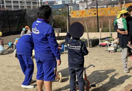 あすか保育園にて、校庭で一緒に遊びながら学んでいます。