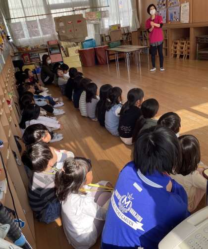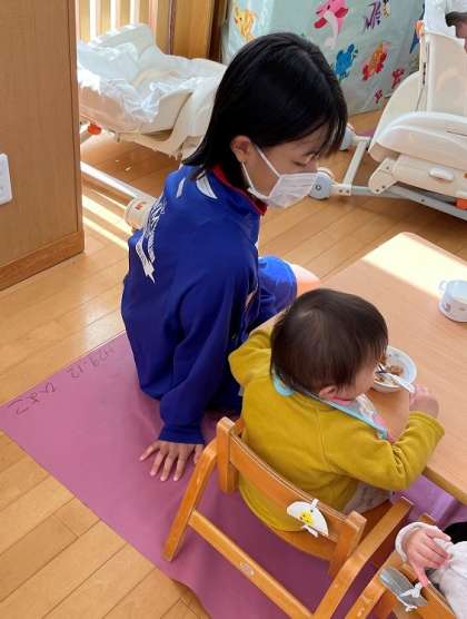 ともしび保育園にて、食事のサポートしたり、お話を一緒に聞いたりしました。
