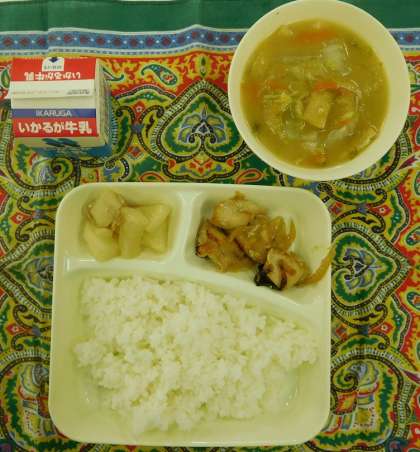 本日の給食 ・鶏肉の甘辛焼き ・みそ汁 ・だいこんの煮もの ・ごはん ・牛乳