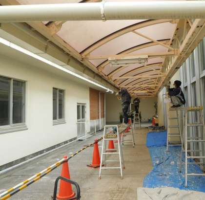 今日から3日間の予定で、ランチルーム横の屋根の塗装工事を行います。