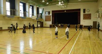 体育館で、「ドッヂボール」をしています。