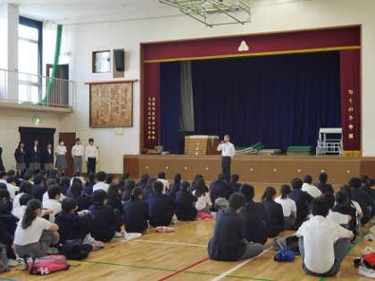 5月25日(月)、7年生から9年生の生徒集会がありました。校長先生からは、6月1日から改正される道路交通法のお話がありました。自転車に乗る際、危険な違反行為をして一定期間に2回以上摘発された自転車の運転者には講習が義務づけられ、場合によっては罰金が科せられること、また、自転車であっても重大な事故につながり、被害者・被害者とも不幸な結果になる可能性があることなど、わかりやすく説明していただきました。生徒の皆さんは静かに聴いていました。また、先生の講話では、テスト前における睡眠の大切さや、テスト勉強の方法などを教えていただきました。