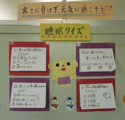 保健室の廊下側に「睡眠クイズ」の掲示をしています。