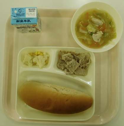 本日の給食 ・豚肉のガーリック焼き ・スープ ・カリフラワーとコーンのサラダ ・パン ・牛乳