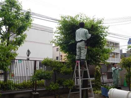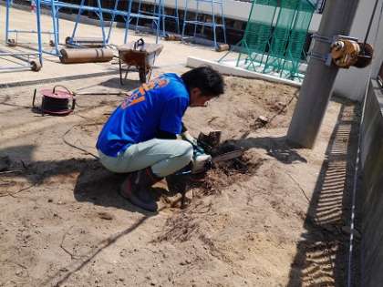 6/9(火)、朝からポツポツと雨がこぼれ落ちる中、今日も管理作業員さんが運動会に向けての校内環境整備を熱心におこなってくれました。今日の作業は高所での木の枝の刈込作業でしたが、管理作業員さんは、児童生徒のみなさんの気づかないところで、たくさんの作業を献身的におこなってくれています。今回の運動会では会場の配置が変わり、「紅組」の児童生徒席が狭くなってしまいました。そのスペースを少しでも広くするために、埋まったままだった木の切り株をチェーンソーで細かく切って掘り起こす作業もしてくれました。みなさんの学園生活はたくさんの人に支えられています。支えられていることに感謝できる気持ちが、じんわりと温かく、児童生徒のみなさんの心にひろがっていけばよいなと思います。