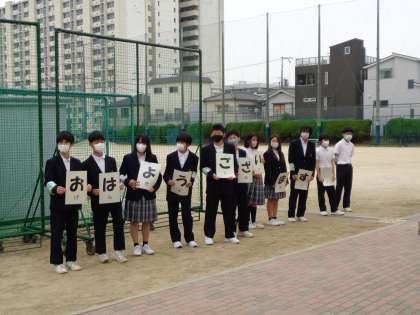 中学生の風紀委員が、正門のところであいさつ運動を実施しています。