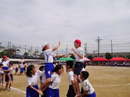 6/14(日)、運動会です。5・6年生の団体競技は、「騎馬戦」です。紅組白組それぞれ10騎あまりの騎馬が凛々しく向かい合いました。運動会では定番の競技ですが、いつも熱い気持ちになれるやりがいのある競技です。合図とともに騎馬が入り乱れました。あと少しで帽子にとどく!あと少しっ!目前の相手に集中しているすきに後ろから迫る相手に帽子をとられてしまいました。それにしても、土台(馬)はいつも少し痛くてきついです。そんなことに乗っている子(武者)は気づいているかな。支える人・支えられる人が一体になってこその戦いです。