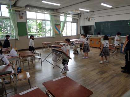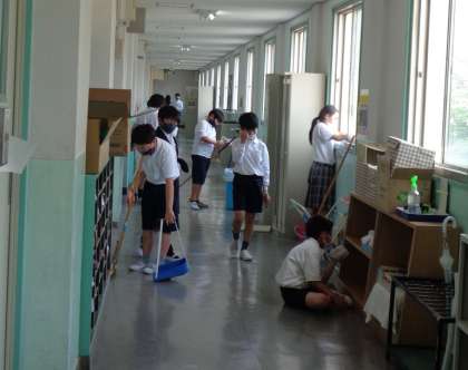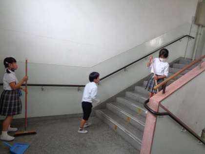 小学校は給食を食べた後、掃除の時間です。教室や廊下、階段もみんなで分担して、きれいにしています。