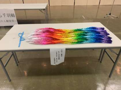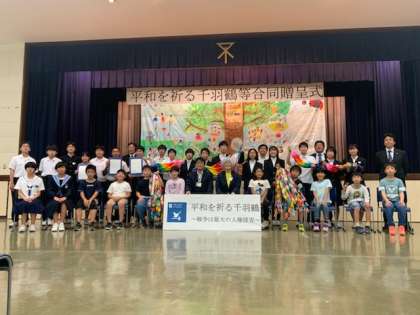 東淀川区役所の「平和を祈る千羽鶴」の企画に生徒会が声かけをして、むくのき学園として1年生から9年生までみんなで協力をして千羽鶴を製作しました。本日、区役所3階 区民ホールにてその贈呈式が行われました。本校以外にも瑞光中学校、淡路中学校、西淡路小学校が参加していました。