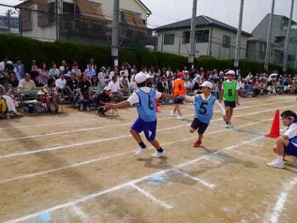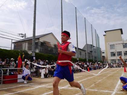 6/14(日)、運動会の最後の競技は、「選抜縦割りリレー」です。紅組白組の男女それぞれが、代表選手を選んで2組ずつの縦割りリレーチームをつくり、最後の競技にふさわしい全力の戦いを繰りひろげました。「位置について よーい パン!」---スタートをきった1年生の小さな体が弾けるように駆けていきました。次々に上級生へとバトンがつながっていきます。懸命な表情。全力疾走の迫力。大きな声援。アンカーの9年生が会場に満ちたたくさんの思いに筋肉がちぎれんばかりの力走で応えました。1年生から9年生までつながったリレー。小中一貫校ならではの見応えのある競技で運動会の競技が締めくくられました。