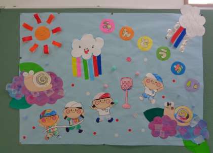 3年生と4年生が一緒に作った運動会のポスターが、1階の廊下に掲示されています。