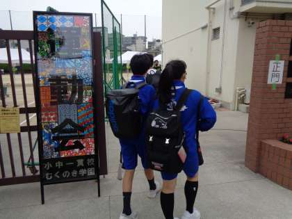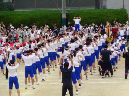天気予報では午後から雨。たくさん練習した演技を優先して、プログラムを変更しました。曇っていますが、熱くなくちょうどいい気温です。開会式のあと、合同体操から始まりました。