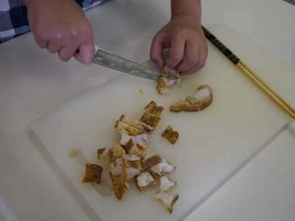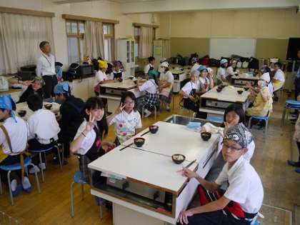 6/18(木)、四者活動(人権を学ぶ自主活動)の1つである部落解放研究会の活動で、地域の方にご指導いただき、「かすうどん」の調理体験をおこないました。「油かす」を細かく刻みフライパンでこんがりと炒めます。甘く香ばしい匂いが漂います。茹でたうどんを素早く水洗いし、お椀に小分けしたら、炒めた「油かす」と薬味をトッピングし、地域の方がひいてくださった出汁を張ります。「いただきます」の声とともに、できあがった「かすうどん」を元気よく頬張りました。「油かす」は牛の新鮮な小腸を素揚げにした保存食です。無駄にすることなく大切な生命をいただく食材であり、先人の知恵から生まれた深い味わいをもつ食材でもあります。初めて食べた子もたくさんいたようですが、地域の方のお話に興味深く耳を傾けていました。貴重な体験学習ができたことに感謝です。