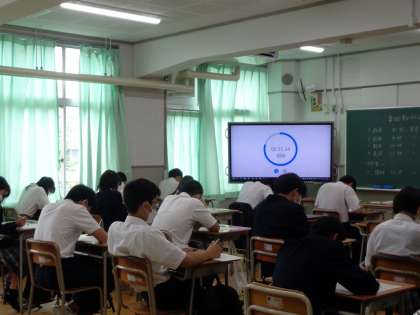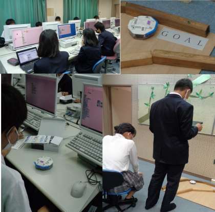 7年生はパソコン教室でプログラミングの授業です。コースを作って実際にロボットを動かします。
