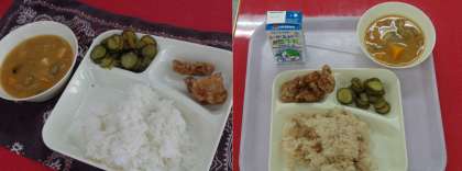 今日の献立は、豚肉のたつたあげ、キュウリの甘酢漬け、みそ汁、ごはん(中学生はたきこみごはん)です。