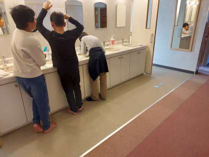 子どもたちも起きて、ふとんの片付けや歯みがきをしています。