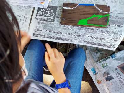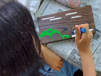 昨日みがいた焼き板に、もようをかいています。