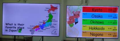 C-NETの先生が3名来ていただいて、オールイングリッシュでのゲームをしています。写真は、大阪市のC-NET全員に聞いたアンケート結果の答えを当てていくゲーム風景です。
