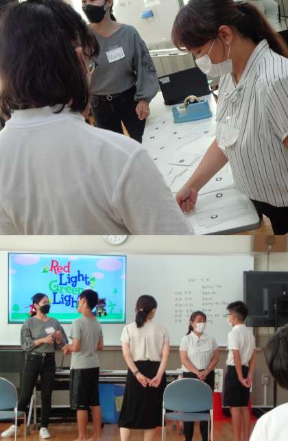 ダンスの後は、緑のカードで「進む」、赤のカードで「止まる」を繰り返し、椅子まで行くと、C-NETの質問に英語で答えてポイントがもらえるチーム対抗のゲームです。
