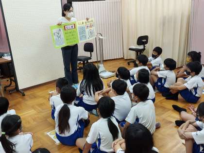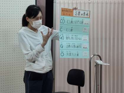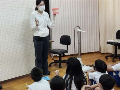 測定前には養護教諭が子どもたちに歯みがきについて指導しています。