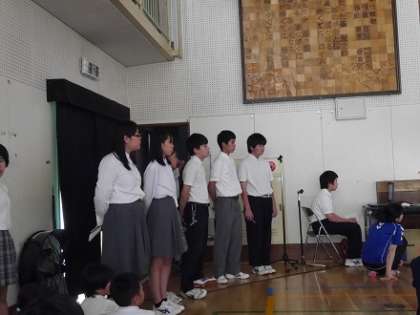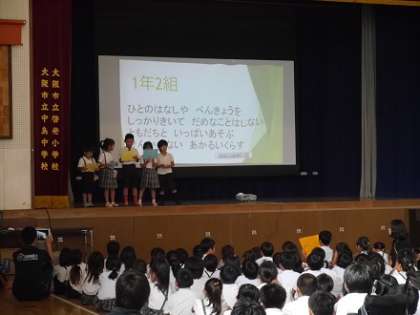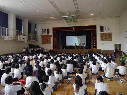 7/3(金)、1〜9年生の全校児童生徒が体育館に集まり、「grow up むくのき」(人権討論集会)の取組をおこないました。1学期のテーマは、「よいクラス・よい学園」です。それぞれの発達段階に応じて、「なかまウィーク」の1週間を中心に、すべての学級で考えを深めてきました。1〜6年生は、テーマに沿った学級目標を舞台で発表していきます。なかま・思いやり・つながり--そのようなことばが目立ちました。7〜9年生は、アンケート調査の結果と学級で討論された内容を、生徒会がまとめて発表しました。集会の終わりには1学期の学校生活を振り返るスライドが映され、学園のきずながより強まったように感じました。人権意識を育むことは、むくのき学園のめざす大きなテーマです。自分とひとを理解すること・自分とひとを大切にすること・自分とひとの幸せを求めること---そのような人権意識の基本を、それぞれが感じ・考える時間をすごすことができました。
