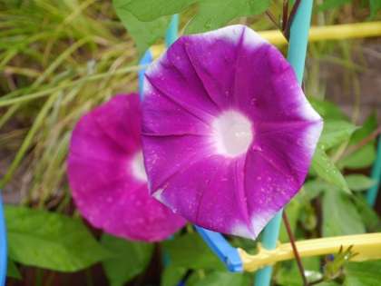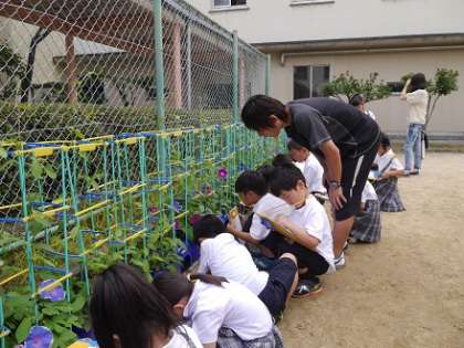 7/8(水)、1年生のみなさんは、生活科の授業で朝顔の観察とスケッチをおこないました。5月に種をまき、ふたばの観察、本葉の観察、支柱をたててつるをからませる等々、大事に育ててきた朝顔です。見事に咲いた花に「きれい」という言葉があちらこちらからきこえてきました。菜園では2年生のみなさんが苗を植えつけた野菜が今日もすくすくと成長しています。学園に児童生徒のみなさんが育てた花や野菜がふえていくのは素敵な光景です。