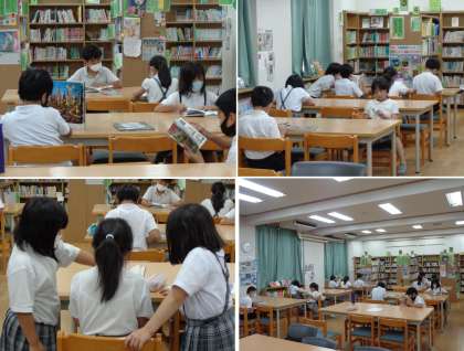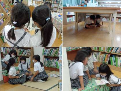 4年生の図書の時間の風景です。好きな本を選んで読んでいます。本を読むスタイルは、ひとりでじっくり読む、友達と一つの本を一緒に読むなどいろいろで、本を読む場所も、畳のスペースや机の下など居心地のいい場所で読書を楽しんでいます。