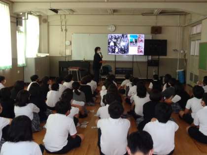 本日6年生は、10月の広島への修学旅行に向けた事前学習として、被爆体験伝承者の山岡さんにお話をしていただきました。