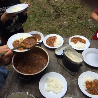 7月25日(土)午前中、飯ごう炊さんで定番のカレーライス作りに挑戦です。簡単そうで意外と味や仕上がりに大きな差が出たりしますが、各班の個性なのでそれぞれに美味しさがありますね。さて、火(まき)、お米、食材など、それぞれ役割を分担して調理を開始。自分の仕事が終わった人から仲間のお手伝い。悪戦苦闘の場面もありましたが、各班無事に完成させることができました。仲間と協力して作ったカレーライスはやはり格別です。和気あいあいと楽しく、美味しくいただきました。