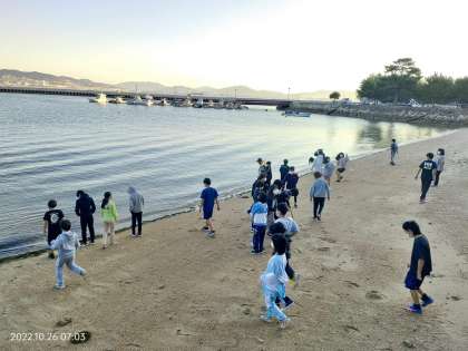 6時半に起床して、朝の会で浜辺を散策しています。
