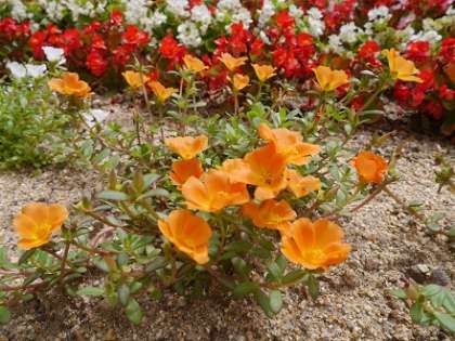 正門の横には管理作業員さんが育てている小さな花壇があります。ちょうど今はポーチュラカとベゴニアが可憐な花を咲かせています。ポーチュラカの花の柔らかなオレンジ色をながめていると、どこか優しい気持ちが満ちてきます。