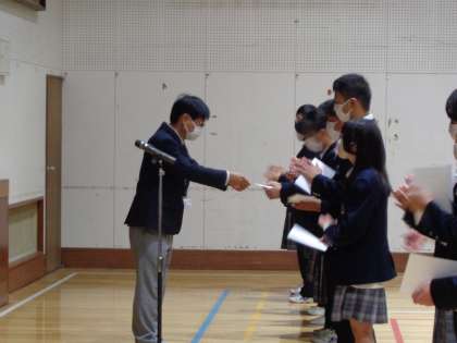 月曜日の朝は中学生の生徒集会です。今日は後期の生徒会執行部と各種委員会の認証式です。これからのいろいろな活動報告を楽しみにしています。