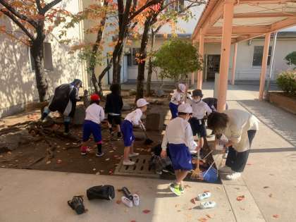 ランチルーム前の木のまわりにもたくさん落ち葉があります。