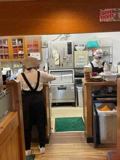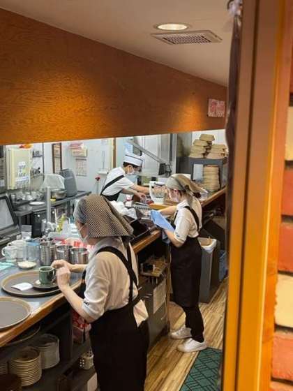 ・ホールでの接客、厨房での洗い場を体験しています。とても忙しくテキパキと働いています。