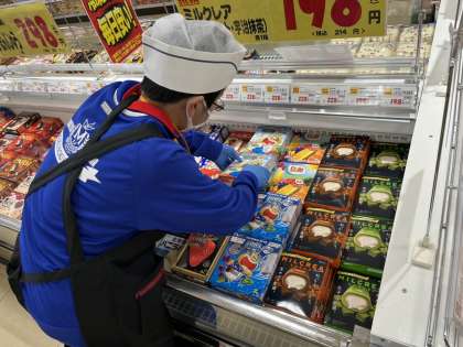 アイスクリームの品出しをしています。寒くなってきましたが、負けずに品出し頑張っています。