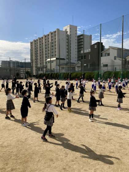 20分休みに1,2年生が運動場に集まり、「ダンゴムシたいそう」をみんなで踊りました。