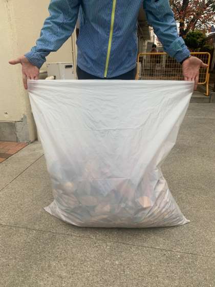 とれる落ち葉のりょうがおおいので、さいきん90リットル入るふくろにへんこうしました。