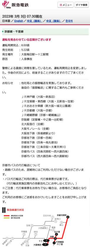 【8:00運転再開見込】阪急京都線・千里線 運転見合わせについて