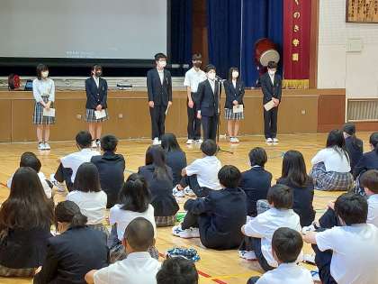 生徒集会があり、各生徒会委員会で話あった目標を代表生徒が発表してくれました。