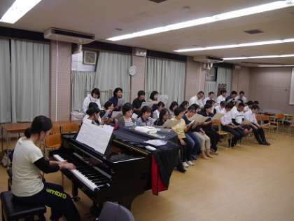 初回は、女声(ソプラノ・アルト)が第2音楽室、男声(テノール・バス)が第1音楽室の別室でそれぞれのパート練習をし、後半は、全体で混声四部合唱をしました。中学校の音楽担当教員からの優しく丁寧な指導により、みるみるうちに歌声のハーモニーが気持ちよくなり、参加者はご満悦のようすでした。来週からでも結構ですので、ふるってご参加ください。