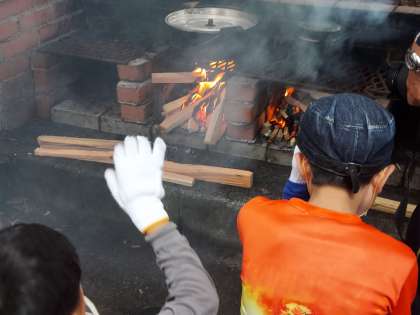 かまどに火をおこす。