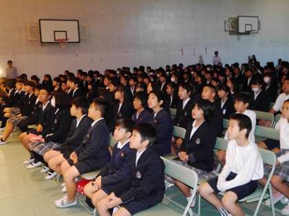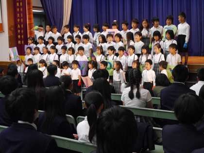 発表する1年生と鑑賞する(見守る)9年生。8年の年齢差です。この光景は小中一貫校ならではのものではないでしょうか。上級生たちは下級生たちの発表をみてどのように感じたのでしょうか。かわいいなという思い。純粋さへの感動。下級生なのにすごいなという驚き。本番とはまたちがう緊張感で発表した1〜4年生、それをさまざまな思いで見守った5〜9年生、それぞれにとってとても有意義な時間になったのではないでしょうか。