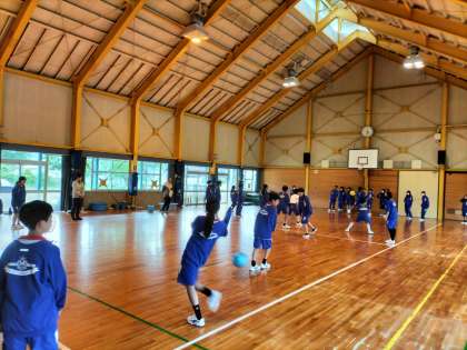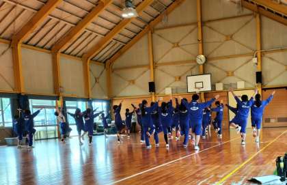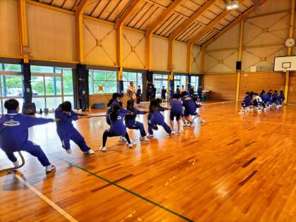 カッター訓練の疲れを感じさせない7年生は体育館でさらにレク大会をします。