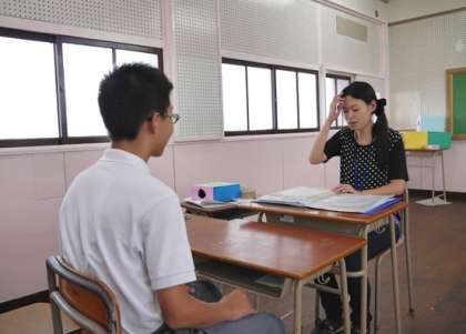10月10日(木)、3年生総合の時間は、テスト勉強【写真中】の傍らで、別室では学級担任と進路の二者懇談【写真左右】が行われました。