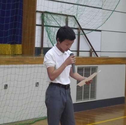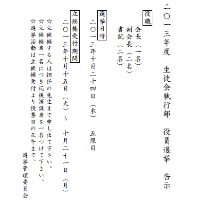 10月15日(火)、生徒会役員の告示が選挙管理委員長より生徒集会で行われました。一年間の任期を務める今回の生徒会役員は、2年生が中心になる番です。新しいメンバーは、来年4月から新しく 『むくのき学園』 が開校しますので、啓発小学校の児童会の皆さんとも話し合いながら、良きリーダーシップを発揮して欲しいと思います。