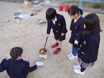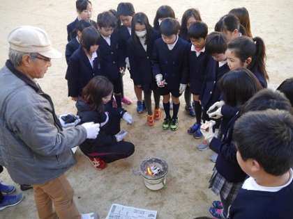 2月3日(水)、3年生では社会科で昔のくらしについて学んでいます。先日の「洗濯板体験」、また「大阪くらしの今昔館」の見学などを終えて、今日は「七輪」の体験学習を行いました。