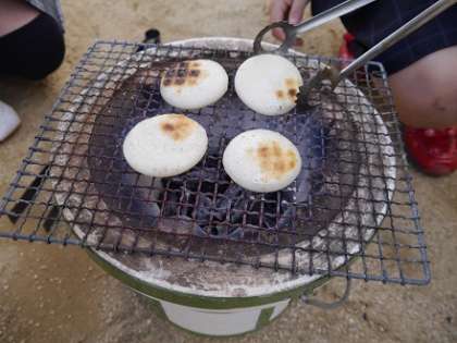1960年代までは、どこの家庭でも日常的に使用していた「七輪」ですが、児童たちは七輪を見るのも、木炭に火をつけるのも初めてです。地域の学習サポーターの方が、使い方を丁寧に教えてくださり、丸めた新聞紙、その上小さな木片、木炭をのせ、マッチで火をつける作業を行いました。なかなか木炭に火がうつらず、苦労しているようすでしたが、なんとか木炭に火がうつり、七輪でふっくらと焼けたお餅の味は、最高でした。