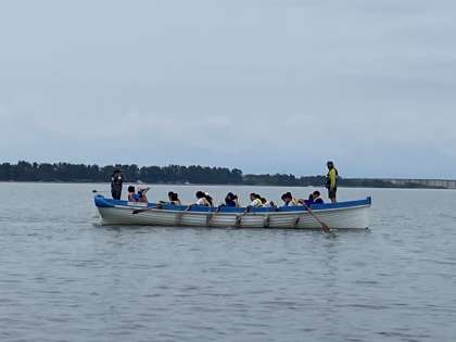 かけ声を合わせ、櫂の動きをそろえて、力いっぱい漕ぎます。