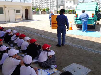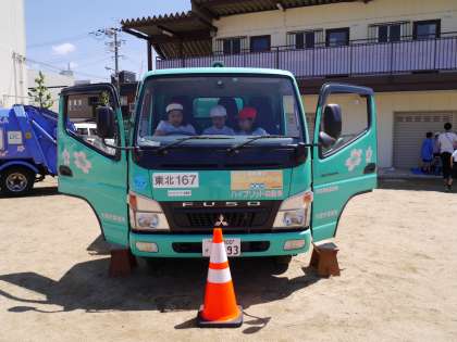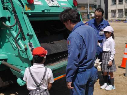 5月13日(金)に、4年生が「ごみ減量・リサイクル」体験学習を行いました。東北環境事業局の方々が、青と緑のパッカー車に乗って来校し、楽しい二時間を過ごしました。まず最初は、パッカー車の種類や構造の説明を聞き、自分たちが持ってきた紙ごみを自分たちでパッカー車を操作しながら収集しました。そして、大きな箪笥がパッカー車の後部に吸い込まれる様子を見せてもらい、その大きな音と迫力に驚きの様子でした。その後、運転席に座って写真撮影をしたり、東北大震災の復旧作業で使用したヘルメットや安全靴・手袋を着用したりするなど、様々な体験をしました。後半は、仕事についてお話を聞いたり、「これ 何ごみ?」ゲームをしたり、質疑応答で学習を深めたりしながら有意義な時間を過ごしました。ごみを集めたり、処理したりする仕事の素晴らしさ・素敵さをたくさん見つけることができました。