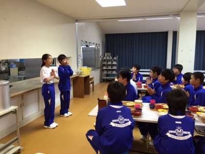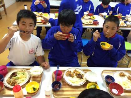 今夜のメニューは、エビフライ、ハンバーグ、から揚げ、スパゲティー、サラダ、酢の物、みそ汁、漬物、フルーツゼリーのデザートで、生徒たちには大満足の献立でした。ごはんもたくさんおかわりしていました。クラスの仲間で会話を楽しみながらいただく夕食は、美味しさも倍増している様子でした。